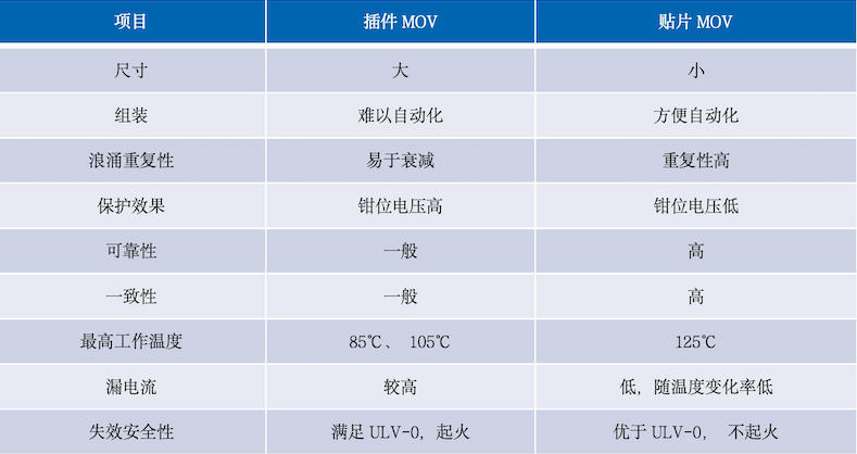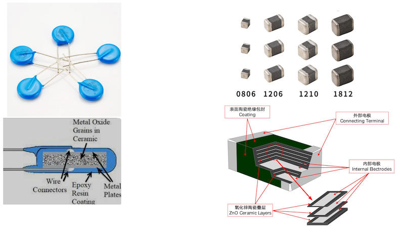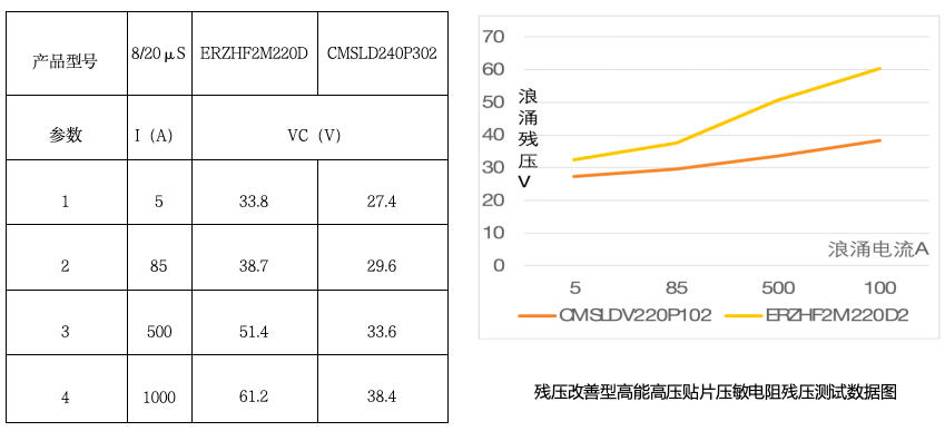 图中分别对插脚压敏电阻以及高能贴片压敏电阻的结构和性能进行对比。