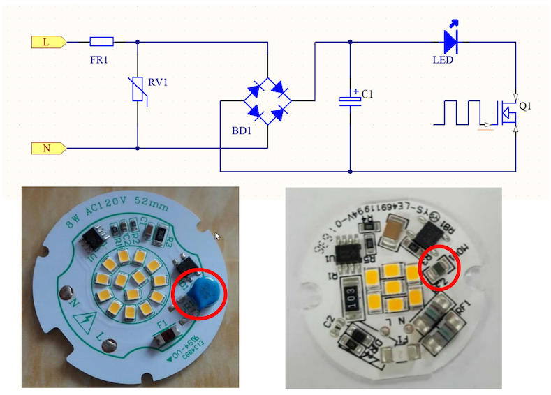 高能贴片压敏电阻的出现,成功的解决了以上的问题,下图就是照明行业的布线原理图和实例图。从下图可以看出,高能贴片压敏电阻使得线性DOB的生产组装变得简单,并且使用效果和安全性得到了极大的保证。