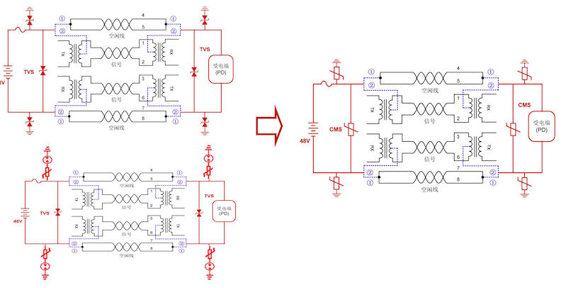 在POE中的保护,传统是有两种典型保护方案,一种是气体放电管串联插脚压敏电阻的模式,一种是TVS的模式,他们各有优缺点,气体放电管的模式,虽然可以做到很大的通流能力,但是保护的效果差,通常要做两级的防护方案,所以用到的器件多,方案复杂,布线空间大,温度的稳定性也不高。现在的方案通常是用TVS的方案,这个方案虽然一定程度上避免了第一个方案的缺点,在保护效果和布线空间上大有提升,但是温度的稳定性仍然比较差,布线的体积仍然很大,比如在RJ45接口端的保护,TVS的体积太大就没有办法布线,再说TVS要达到比较高的浪涌防护能力,必须用TVS芯片叠片的方式,造价比较高。
