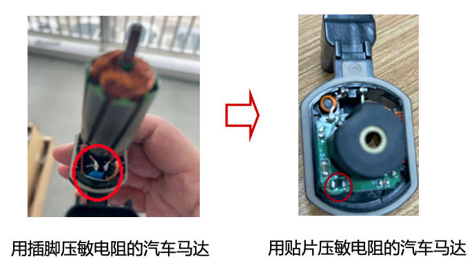 -40℃~125℃的宽温度范围内,各项电参数方面不能折减,甚至有的客户提出150℃或者175℃的环境工作要求,能自然满足该需求的就是高能贴片压敏电阻了。在当前马达的生产中, 消噪通常是用插脚压敏电阻,插脚压敏电阻最大的问题就是组装需要手工焊接,一致性差,并且绝缘距离也不够,而用贴片压敏电阻,就能方便的实现自动化和有效保证绝缘距离,并且在高温稳定性和保护的一致性方面,都优于插脚压敏电阻。下面就是这两种方式的比较图片。