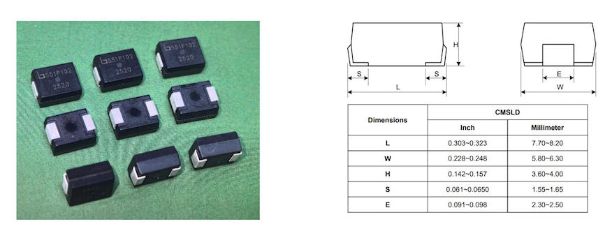 如果用低残压的高能贴片压敏,就能解决这些头疼的问题。一个方面就是高能贴片压敏电阻本来就是小体积大通流的产品,所以一颗同样体积的产品,可以替代3颗甚至6颗TVS管,并且没有多颗TVS管并联的误差匹配问题,也就是工程师所谓的“肩膀”问题,如果能同时降低高能贴片压敏电阻的残压问题,就可以使用低耐压的MOS管,并且减少了布线的面积,从而降低了设计的成本,同时也减少了失效的风险。 下图比较了CMSL产品跟大功率TVS的尺寸对比。