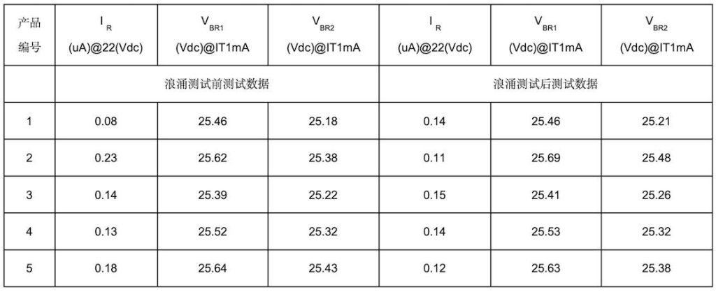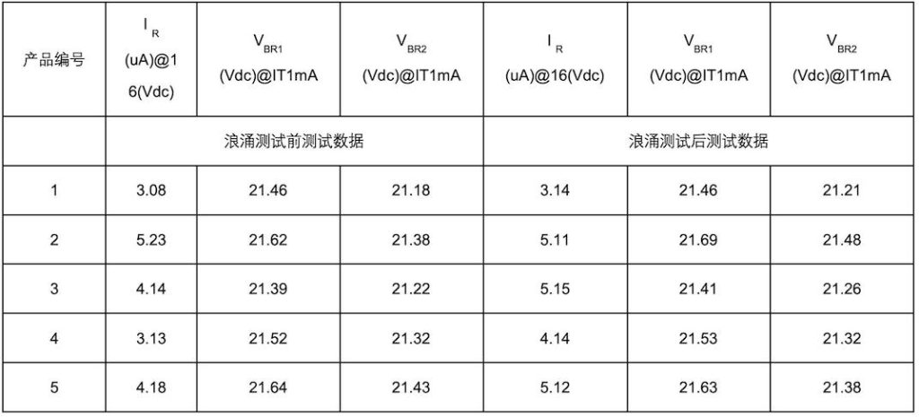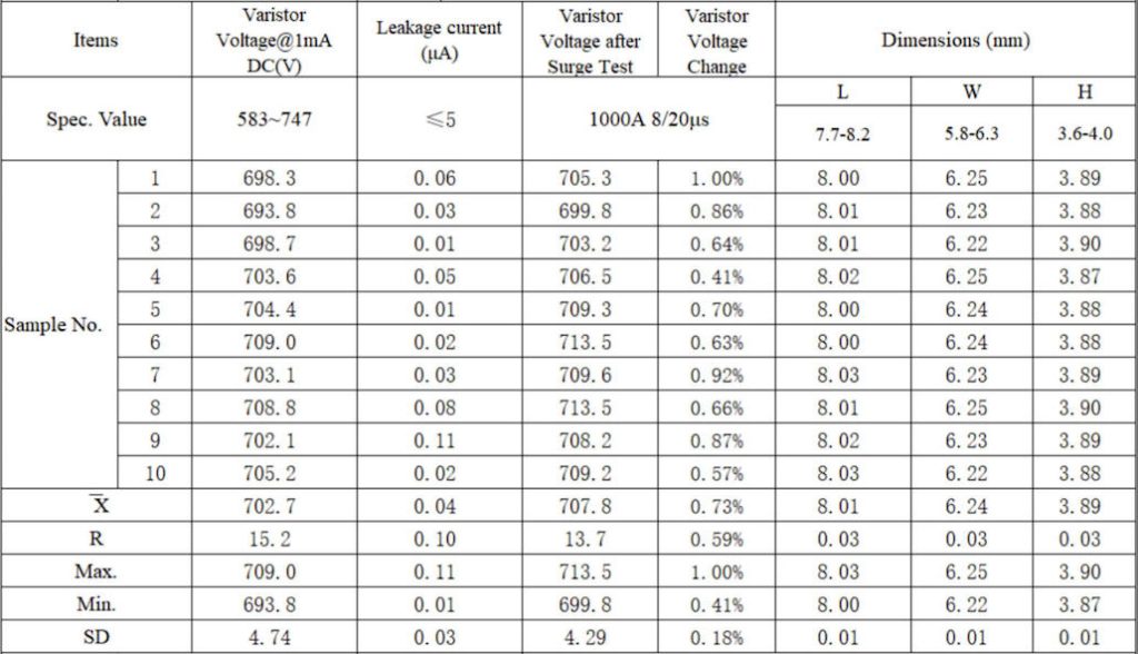 从常规参数的测试数据看, 1mA下的击穿电压在700V左右,能满足两倍的工作电压耐压440VAC的耐压测试,在550V直流条件下,漏电流小于5 μA 。在浪涌防护能力方面,可以通过8/20 μ s 1KA的测试,满足客户希望的1.5KV 750A的要求,在残压上,在浪涌波形8/20 μ s冲击下,2000V浪涌的残压不超过800V,可以满足客户对1.5KV浪涌冲击下残压的测试要求。具体的测试数据见下表。