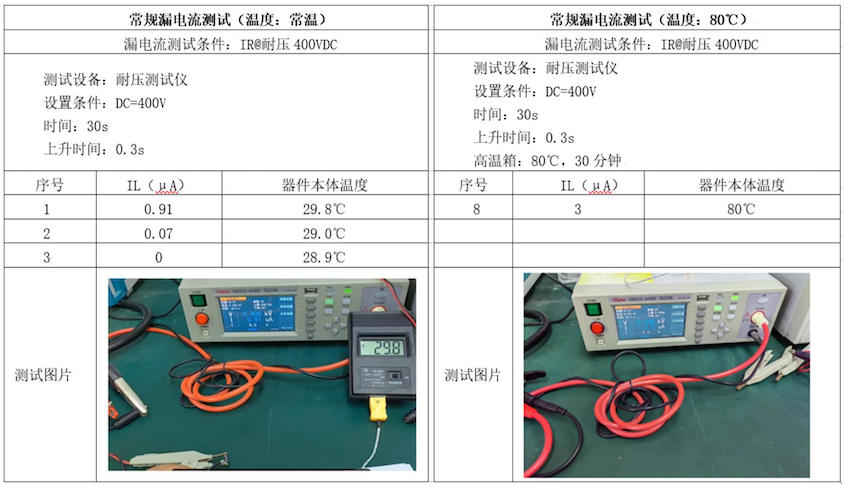 对于汽车电子12VDC的电源来说,都有24VDC的耐压测试,具体耐压需要多少时间,需要客户跟供应商协商, 国外某知名厂商P的规格书里,这个耐压的数字是24VDC,时间是5分钟; 我们在常温下测试,P公司是可以通过5分钟耐压测试的,考虑到汽车的内部环境温度会到80度或者更高,所以对于耐压测试,不考虑残压的情况下,是越高越好,测试的结果表明,P公司的可以通过规格书的要求,1mA击穿电压不到22V,电流已经超过了3mA, 产品的表面温度比较高。国内厂家B,在同样测试条件下,击穿电压超过25VDC,在24VDC下的漏电流小于1mA,产品的表面完全不发热,耐压性能稳定。