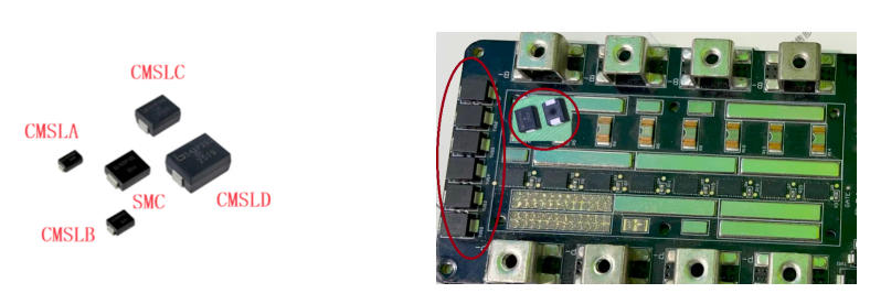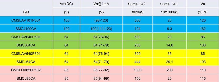 从下表的测试数据可以看出,一颗SMA封装尺寸的CMSLAV101P501,可以通过8/20us 500A 的通流,而残压只有120V,作为对比,一颗SMCJ100CA的TVS,通流只有124V,残压162V。考虑到BMS的充放电的MOS管保护中,波形更接近于10/1000us的波形, 以及实测中,TVS管也留有足够的余量,所以一颗CMSLAV101P501可以对超过1颗的TVS SMCJ100CA(功率5KW)的替代。同样,用一颗CMSLD820P102 可以对SMCJ85CA的产品进行超过6颗的替代。
