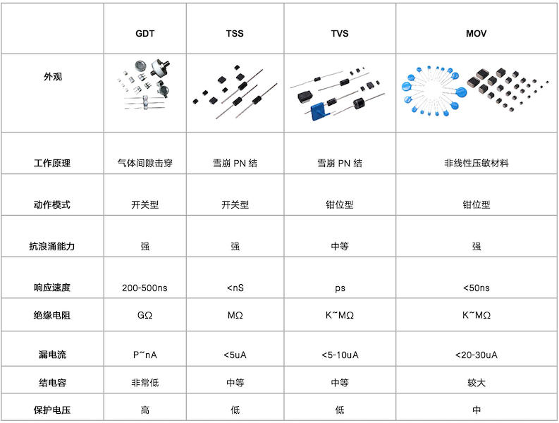 从更细分的电气特性来说,这些开关型器件和钳位型器件,根据产品本身的属性和应用的特点,各有优势和适合的应用场合,下图是对这些产品的一个对比说明。